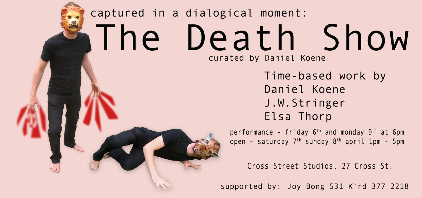 An exhibition featuring time-based by artists Daniel Koene, Elsa Thorp and J. W. Stringer, captured in a dialogical moment: The Death Show also included live performances on the opening and closing dates.