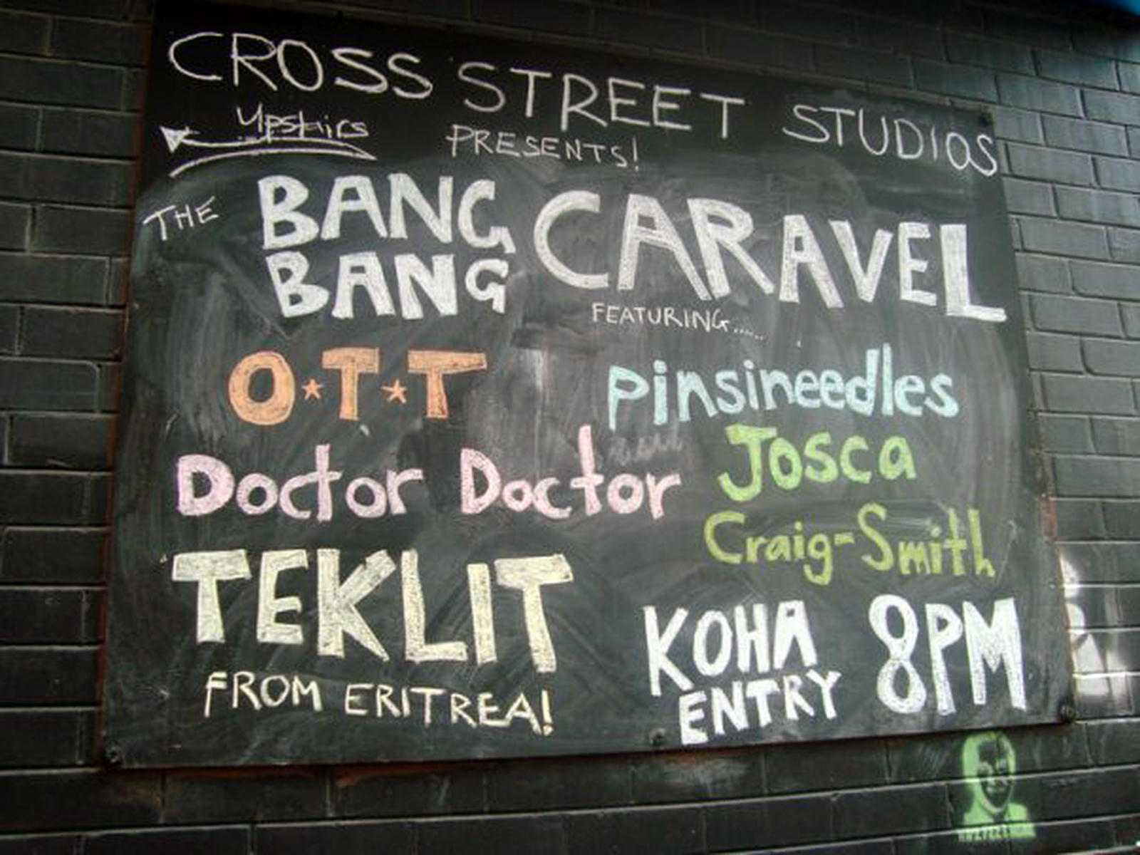 The night included impromptu performances by the group O.T.T.; the "two minute madness" of Pinsineedles (also known as Stitches); the vocal harmony of Disciples (Junior’s Barbershop Quartet); the sonic experiments of duo Doctor Doctor; and original live music from Eritrea and Ethiopia by Teklit. Visual artist and Cross St Studios member Josca Craig-Smith also exhibited new work for the occasion.