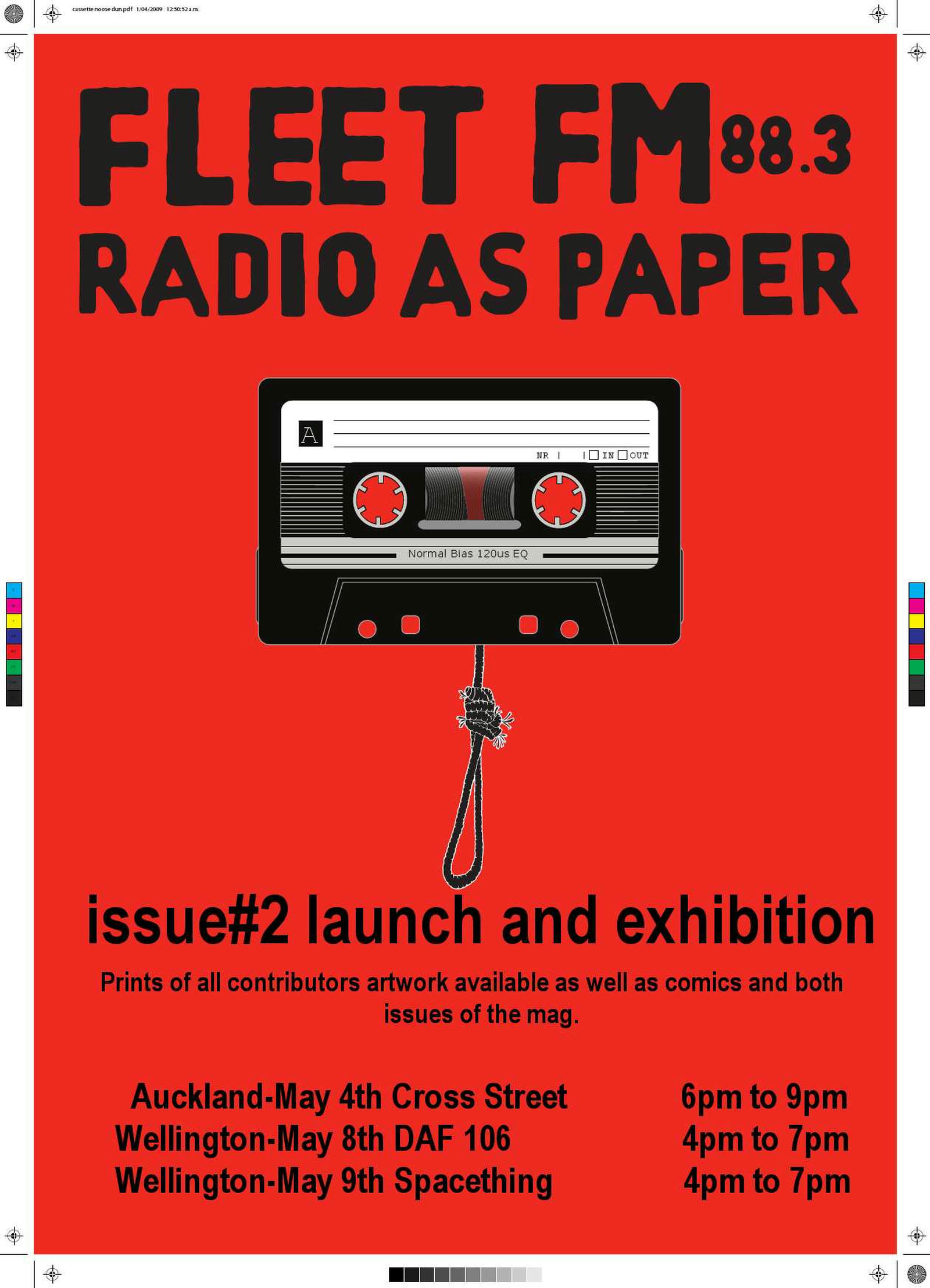 This event was the start of a brief North Island tour, with the exhibition travelling directly from Tāmaki Makaurau to Te Whanganui-a-Tara Wellington, where Radio as Paper and its original artwork was presented at DAF 106 (8 May 2009) and Spacething (9 May 2009).