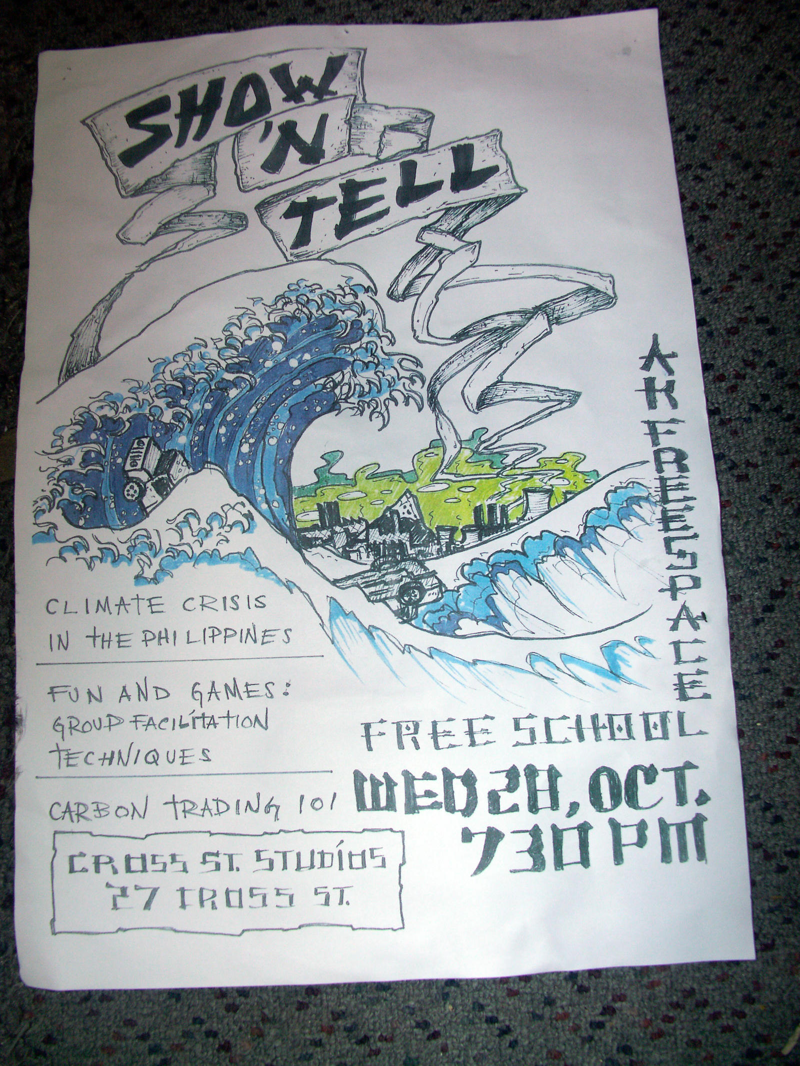 The AK Freespace Collective hosted their free school at Cross St Studios for a second time, presenting community-directed talks and workshops on pressing social and political topics. The session covered subjects such as: Climate crisis in the Philippines, Carbon trading 101, and Fun and games: group facilitation techniques.