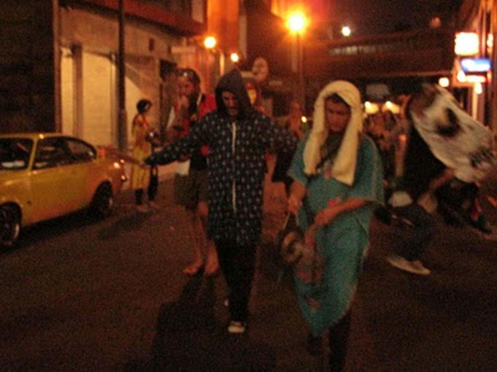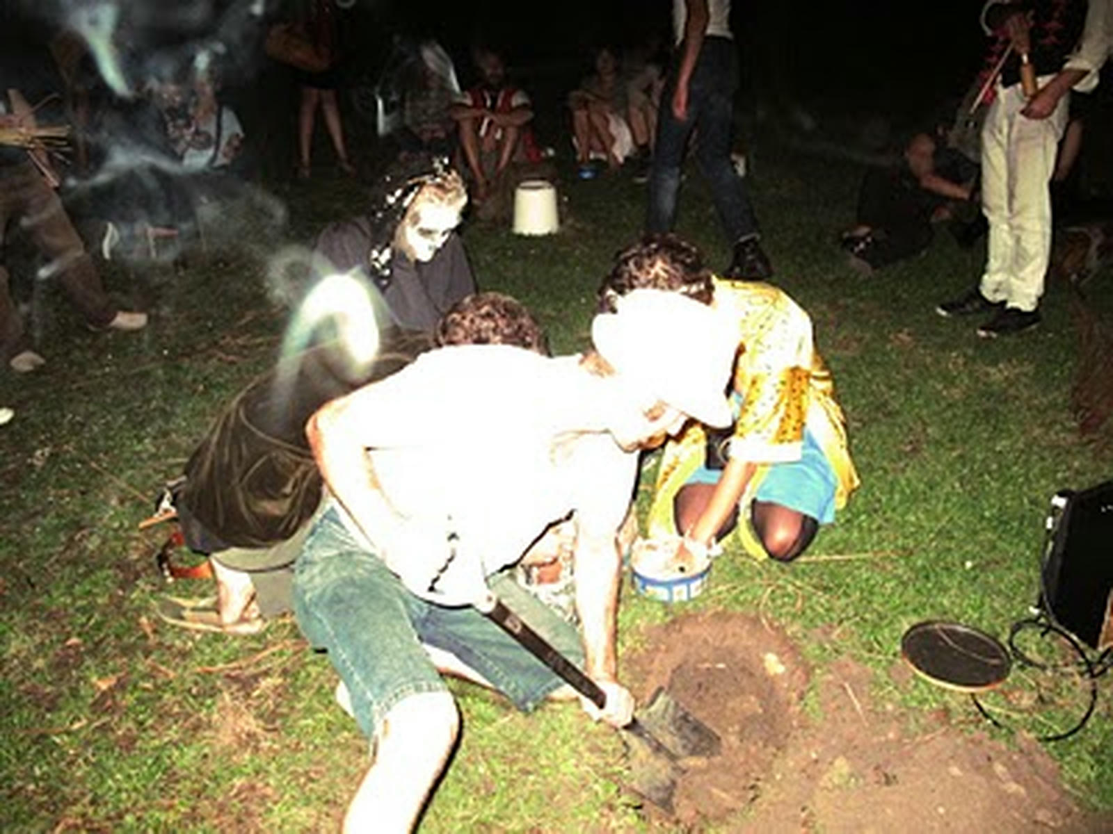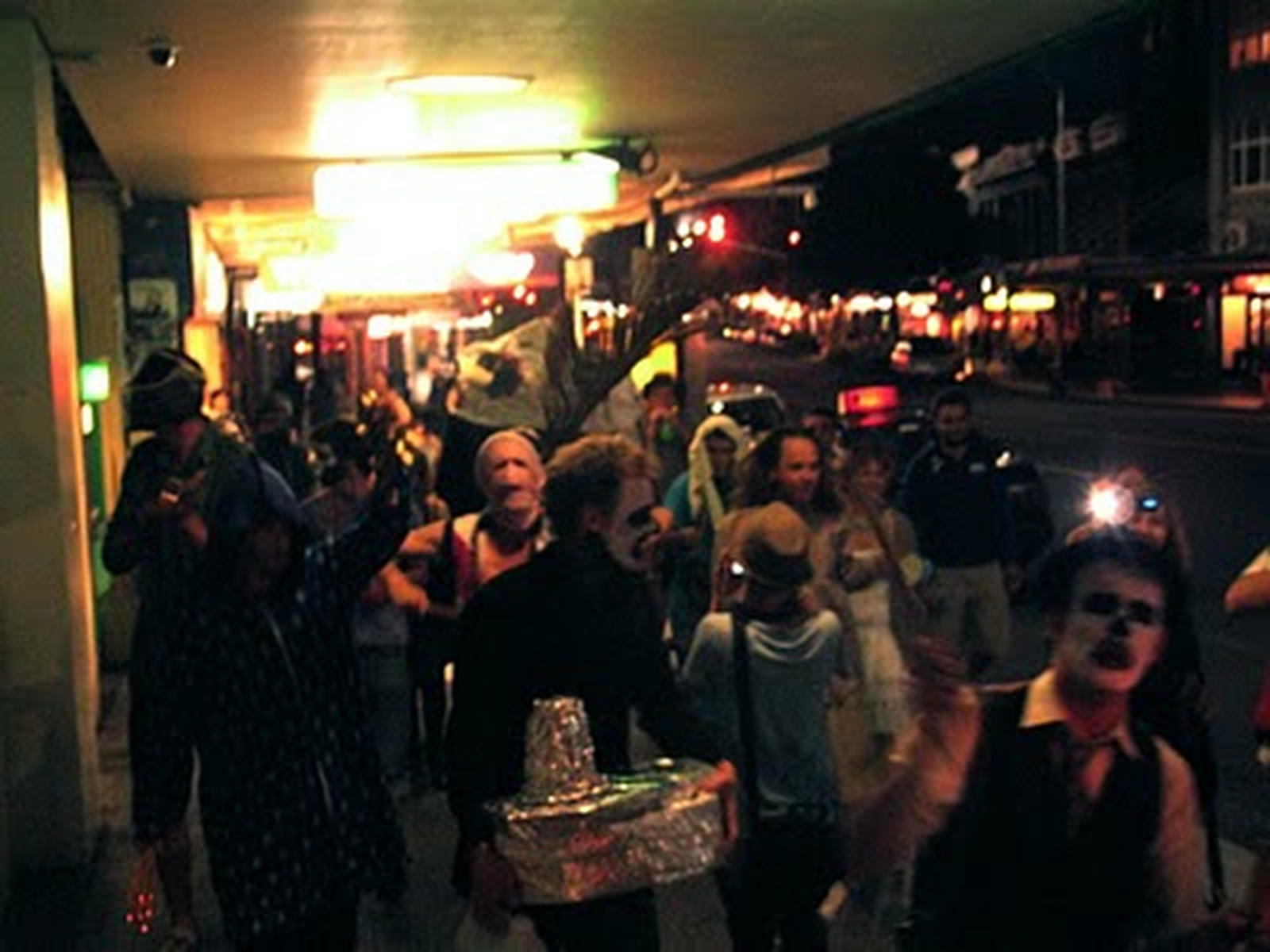 In keeping with the collective's ethos of community involvement, this participatory ritual invited close friends to wear costumes and bring any instrument or noise-making device for a festive procession along Cross Street, up Karangahape Road and into the Symonds Street graveyard for the final interment.