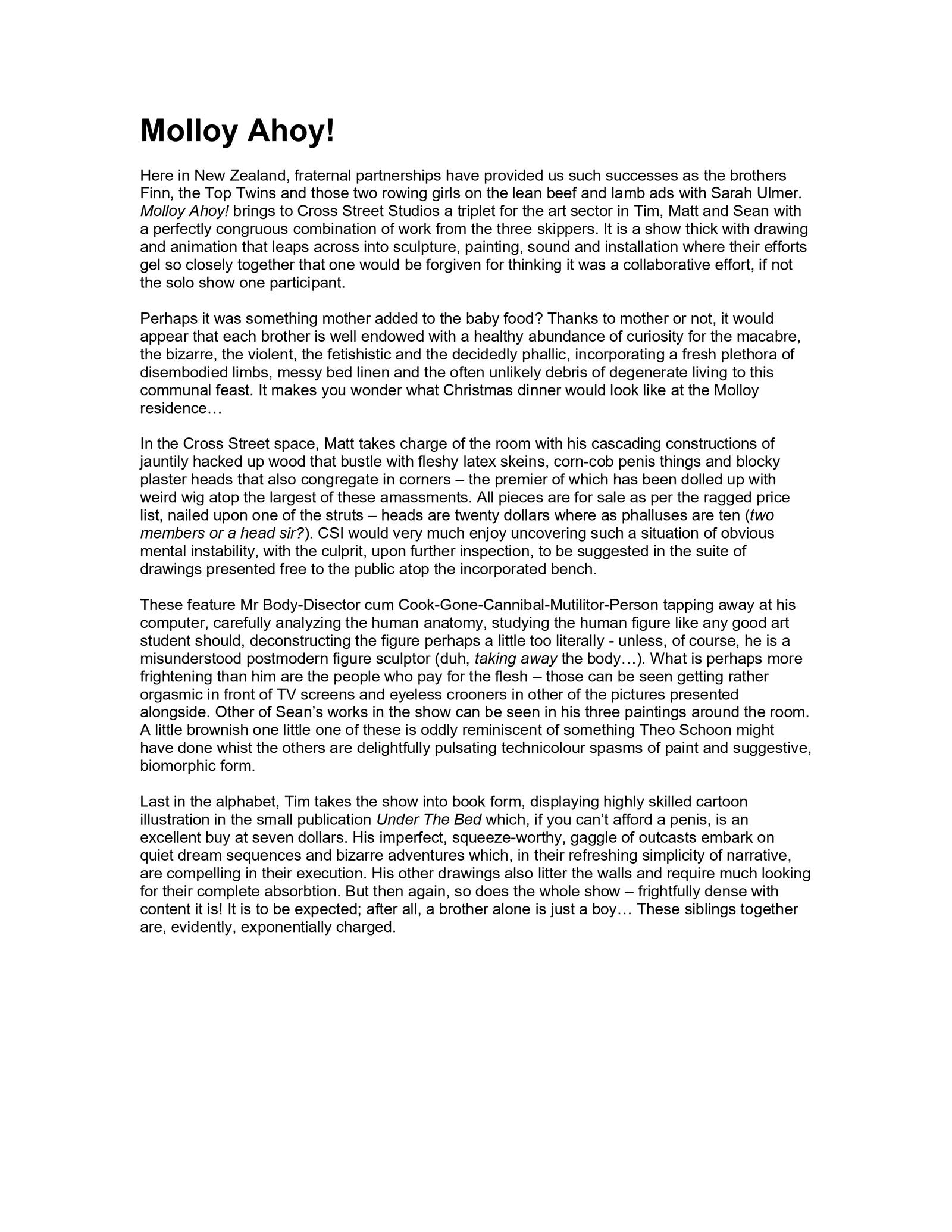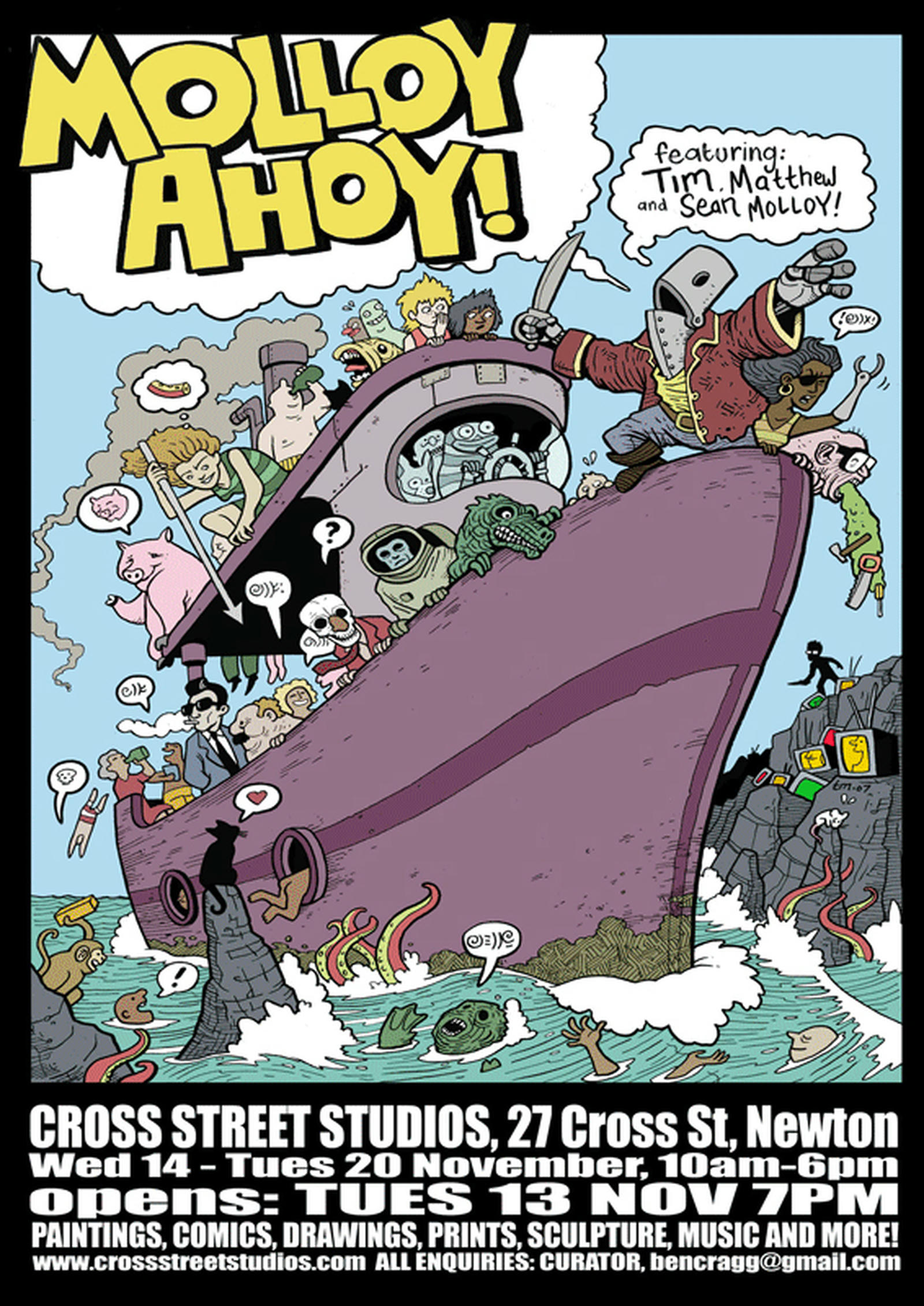 Curated by Ben Cragg, Molloy Ahoy! was the first time the three Molloy brothers—Matthew, Sean and Tim—exhibited their work together.