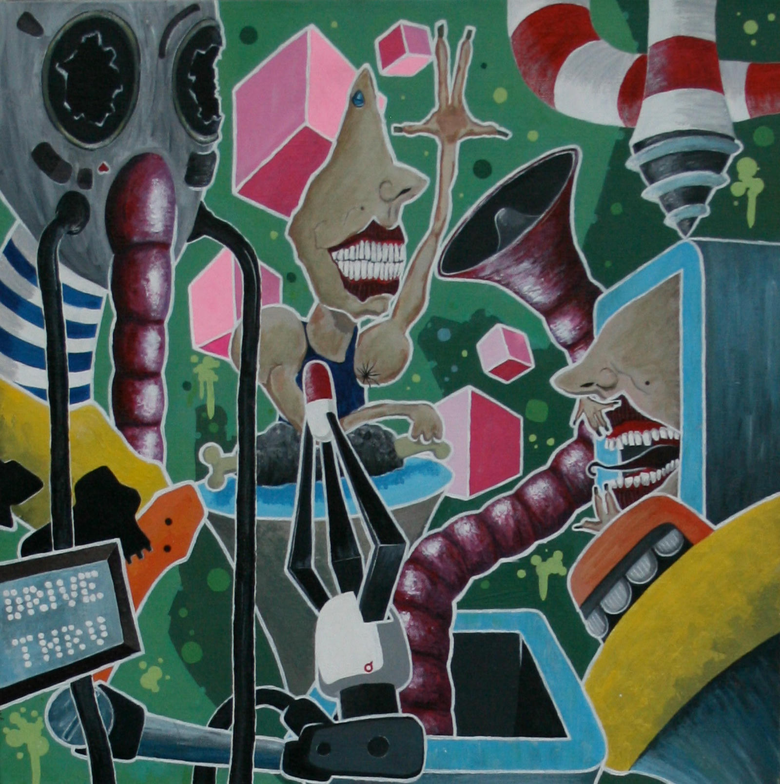 Often manifesting as layered digital collages and deconstructed drawings, Manchego's work uses repetition and found imagery to explore themes of modern identity and consumption; while for this exhibition, Mai presented mixed-media works that channeled a lowbrow, even grotesque style, that incorporated elements of surrealist dystopia.
