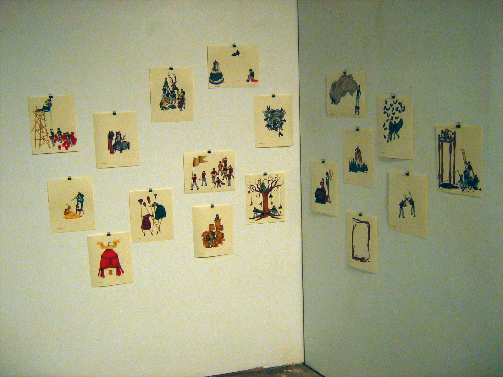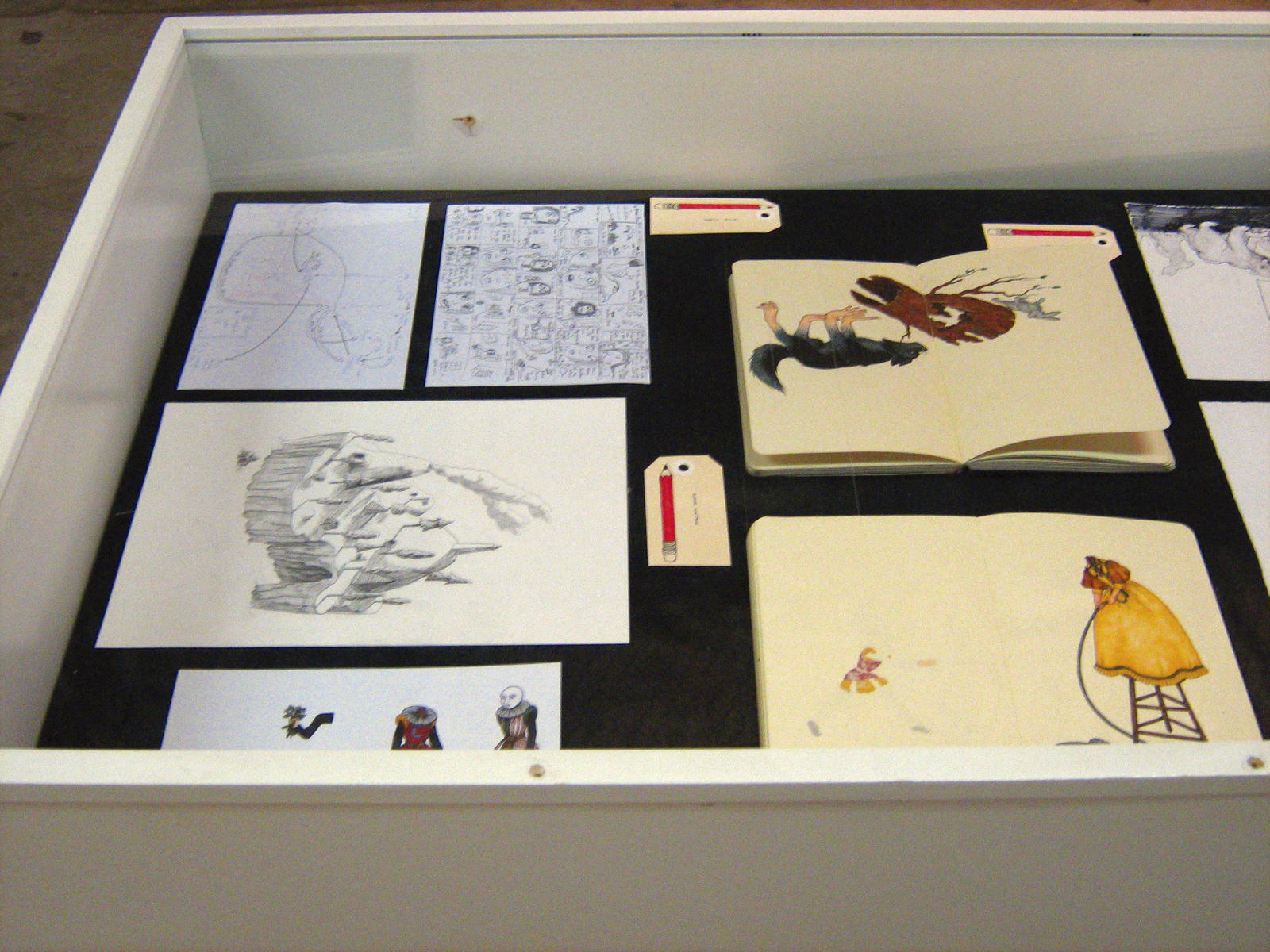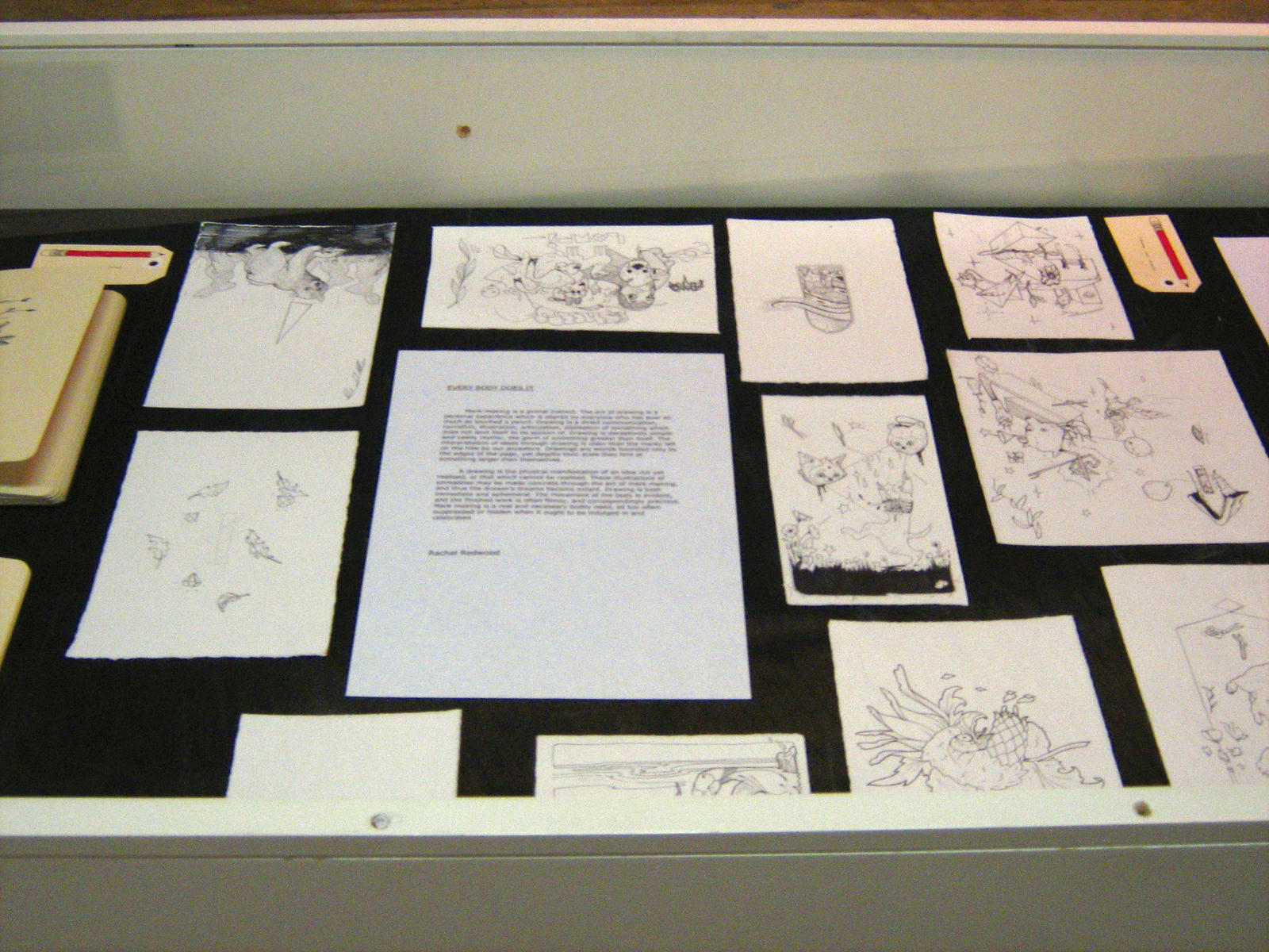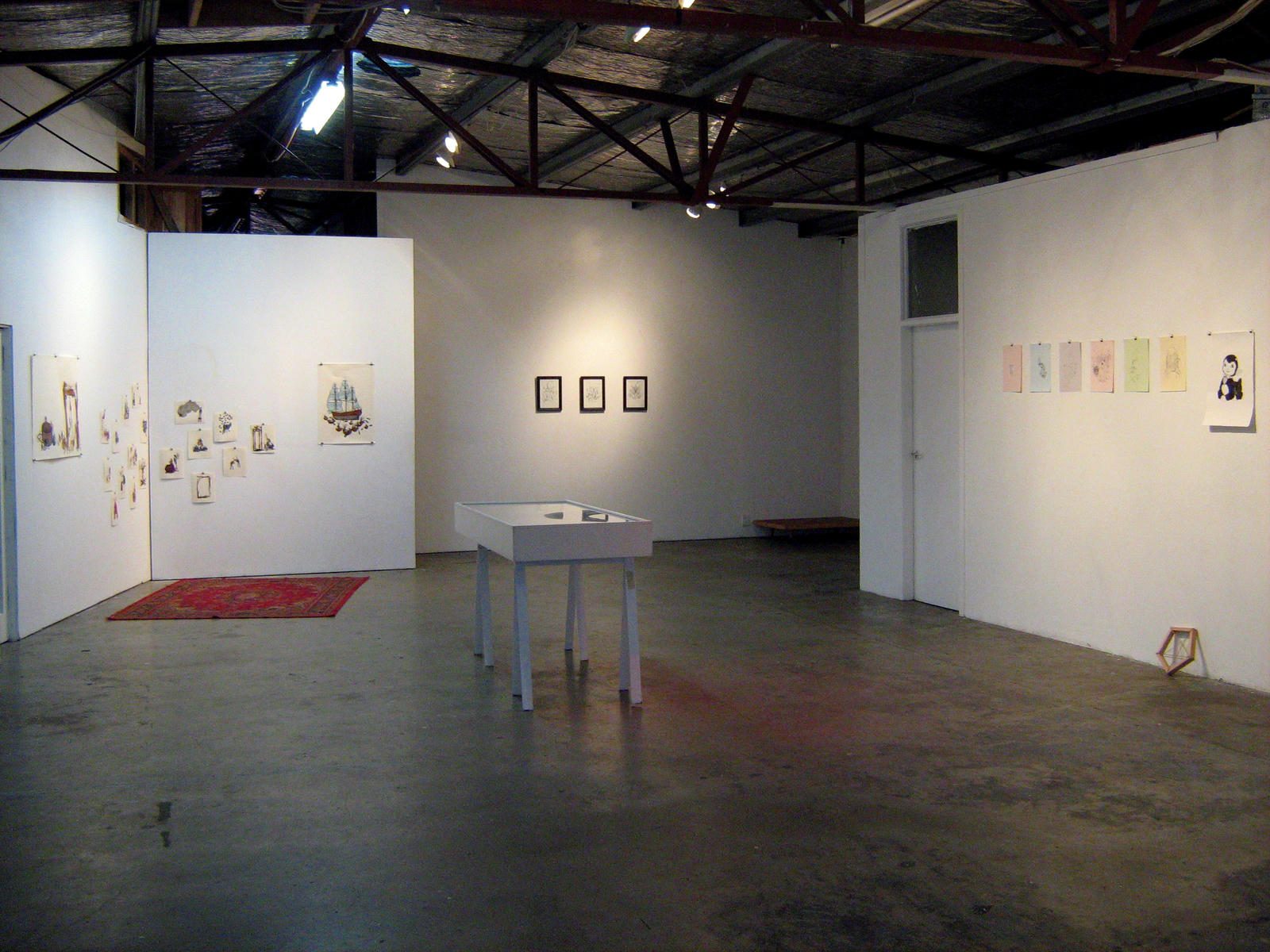 Conceived as a "library" that blended pop culture with personal honesty and absurdity, this collection of works encouraged viewers to stitch together their own narrative and interpretations of the theme. Accompanying the show was a book-size catalogue with reprints of the exhibited artworks and a text by Rachel Redwood, which looked at drawing as a primal form of mark-making and non-verbal communication.
