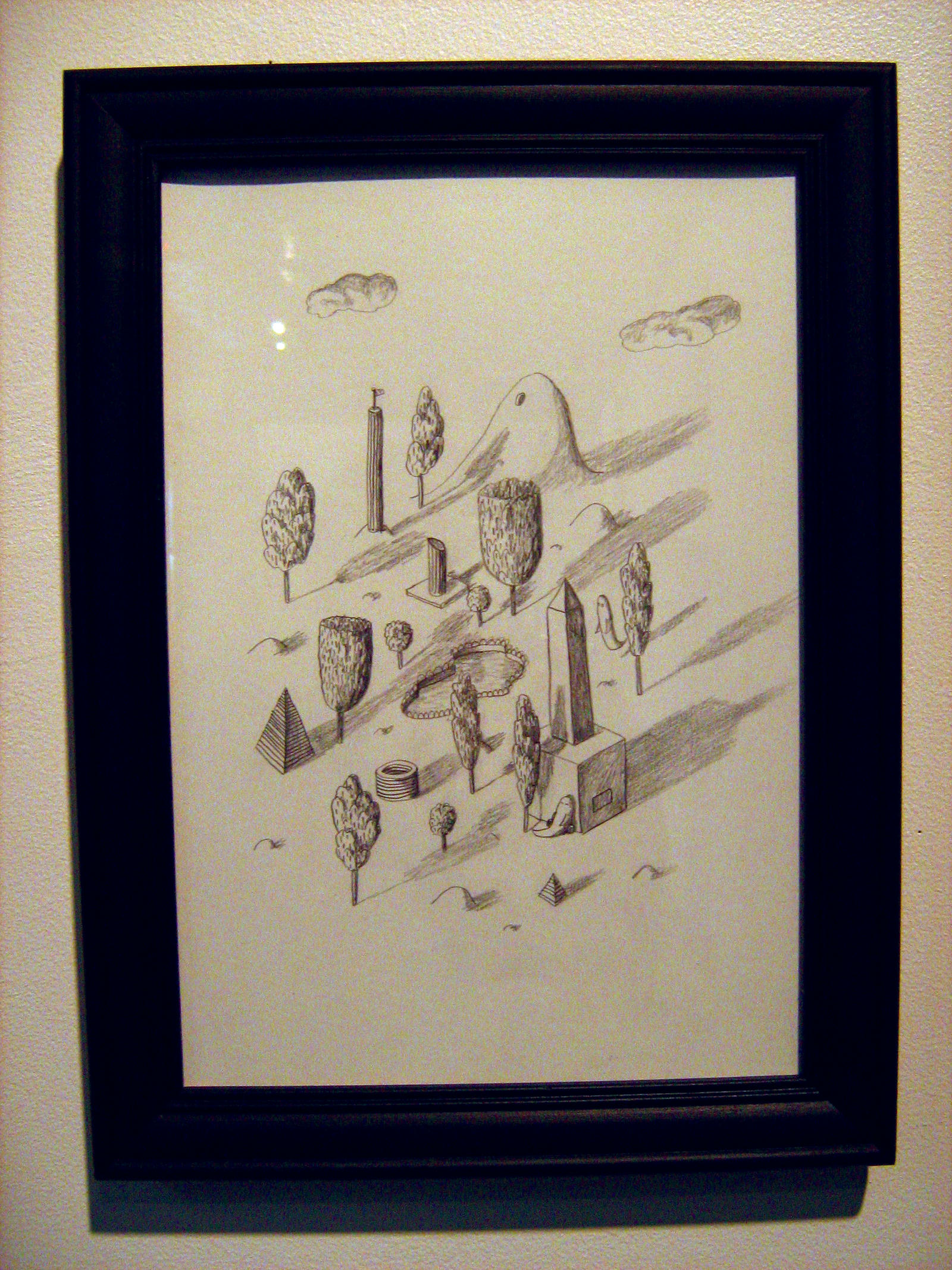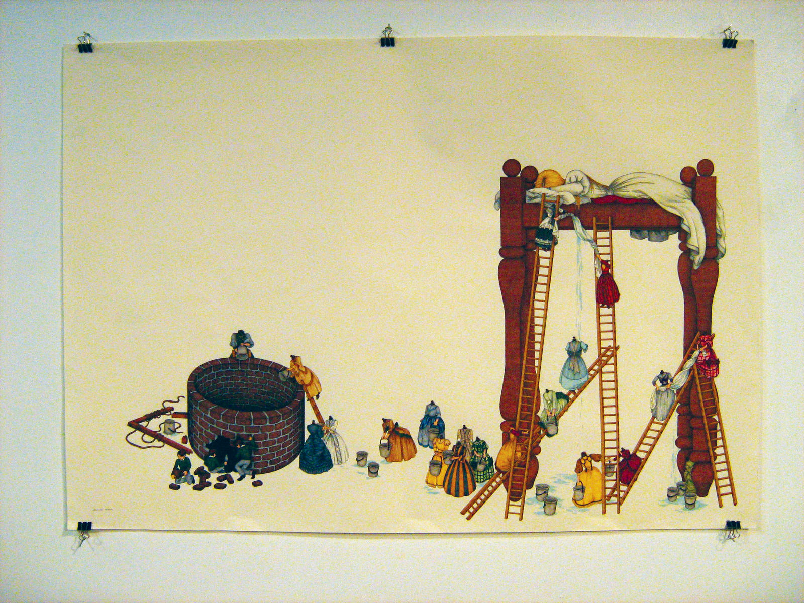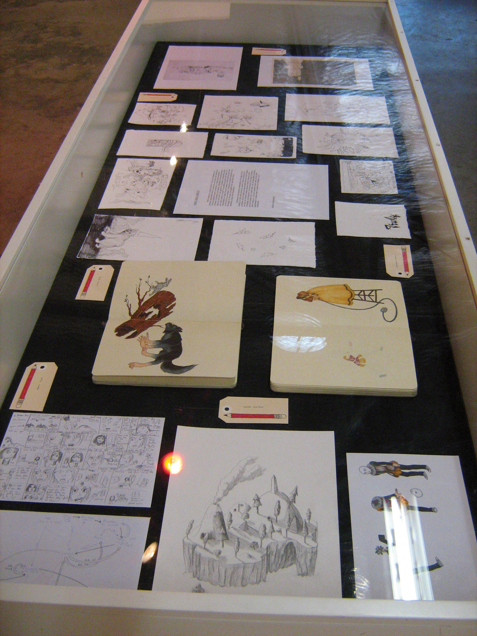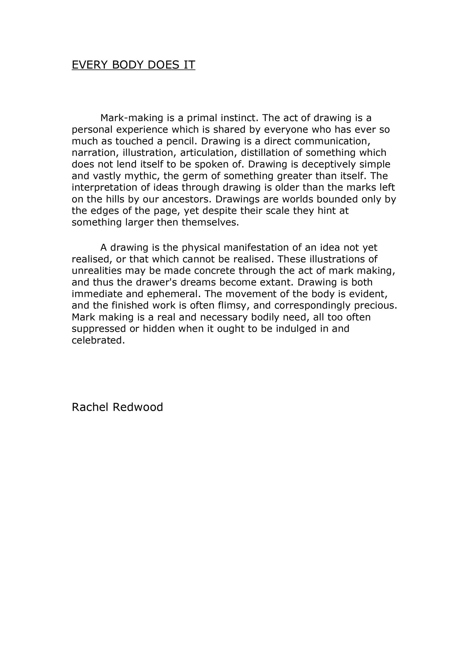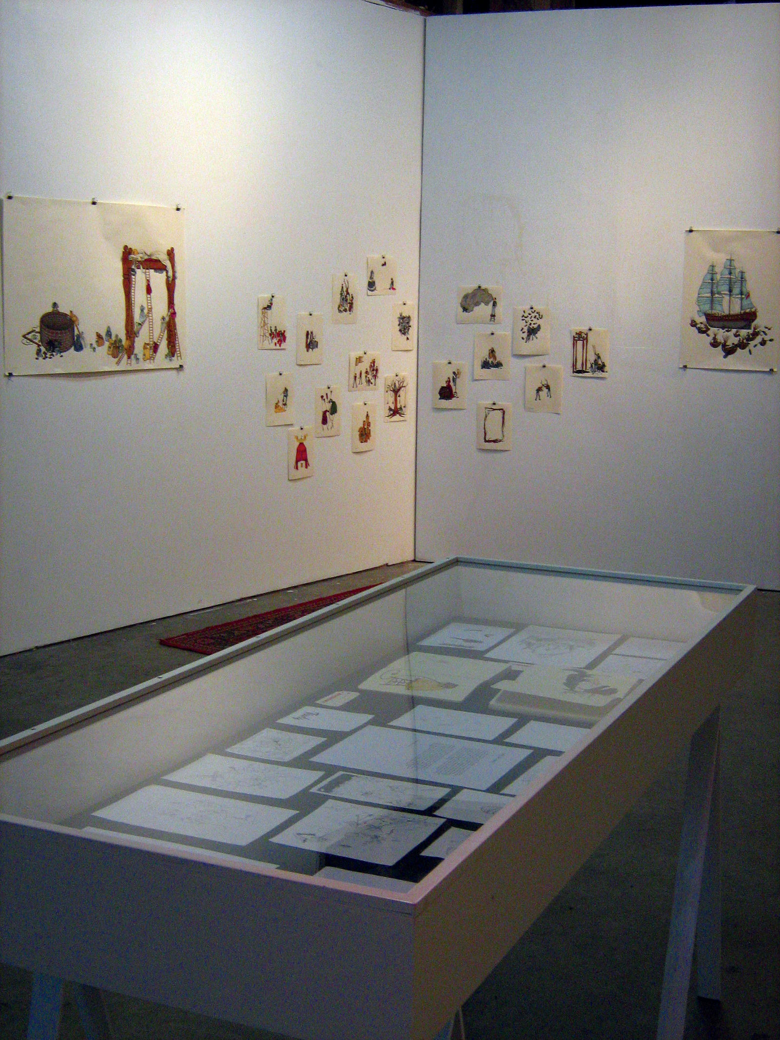 Conceived as a "library" that blended pop culture with personal honesty and absurdity, this collection of works encouraged viewers to stitch together their own narrative and interpretations of the theme. Accompanying the show was a book-size catalogue with reprints of the exhibited artworks and a text by Rachel Redwood, which looked at drawing as a primal form of mark-making and non-verbal communication.