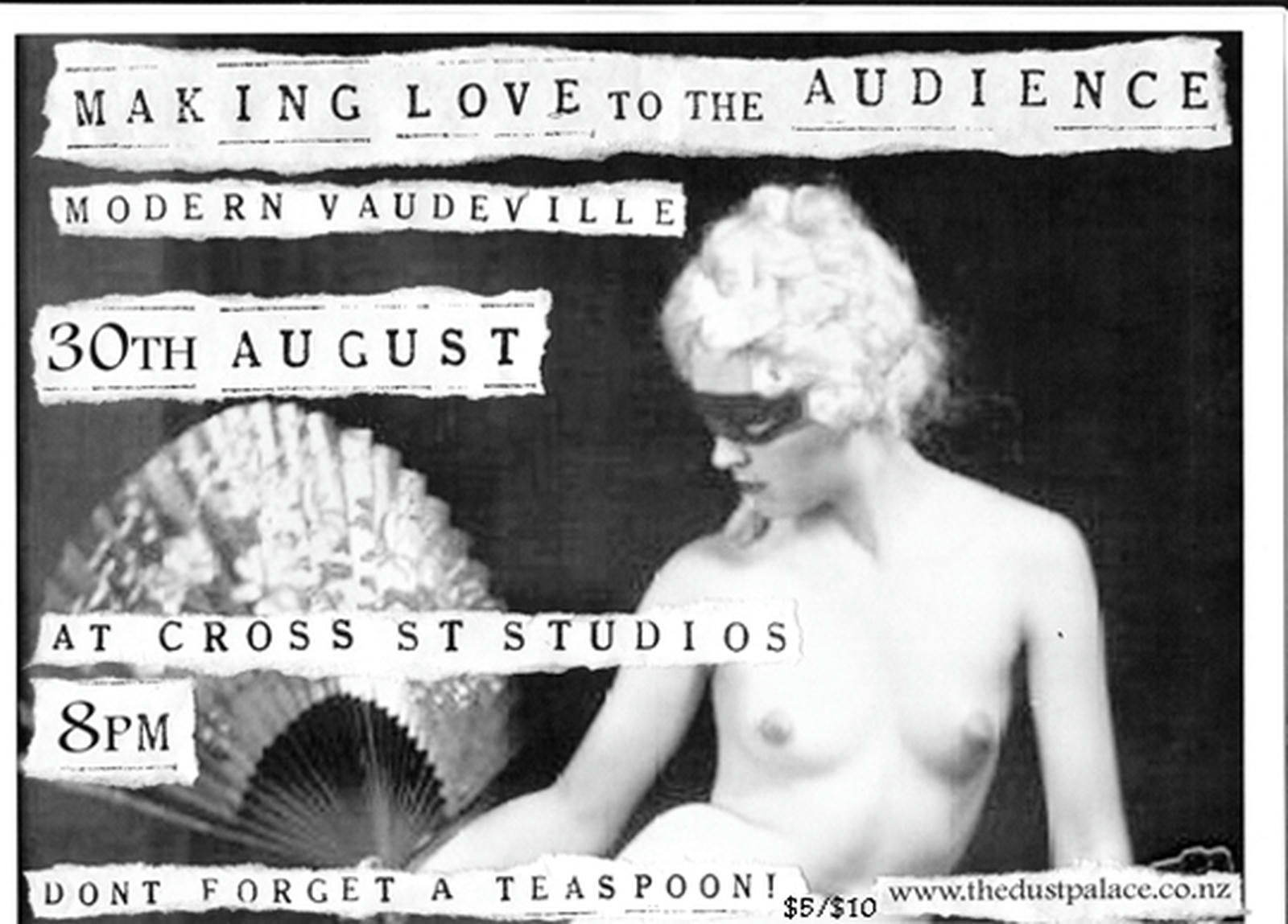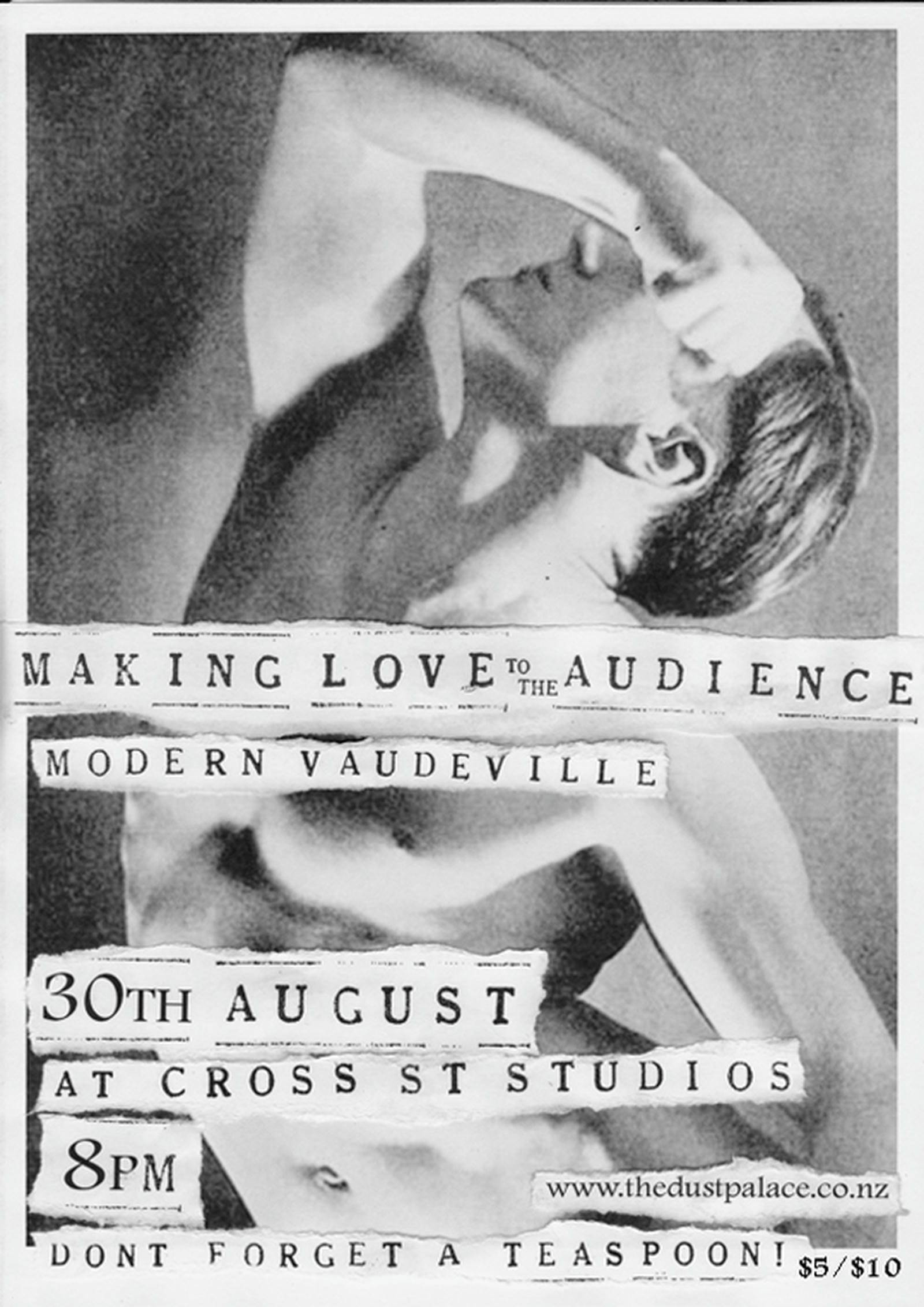 MAKING LOVE TO THE AUDIENCE was a bi-monthly event designed to foster new, unfiltered performative ideas from Tāmaki Makaurau Auckland's artistic community. Completely inclusive, the series embraced the DIY spirit of the underground scene and provided a non-judgmental venue for acts that might not otherwise have a home. These evenings were structured with short films interspersed throughout the live acts and often included unique sensory elements.