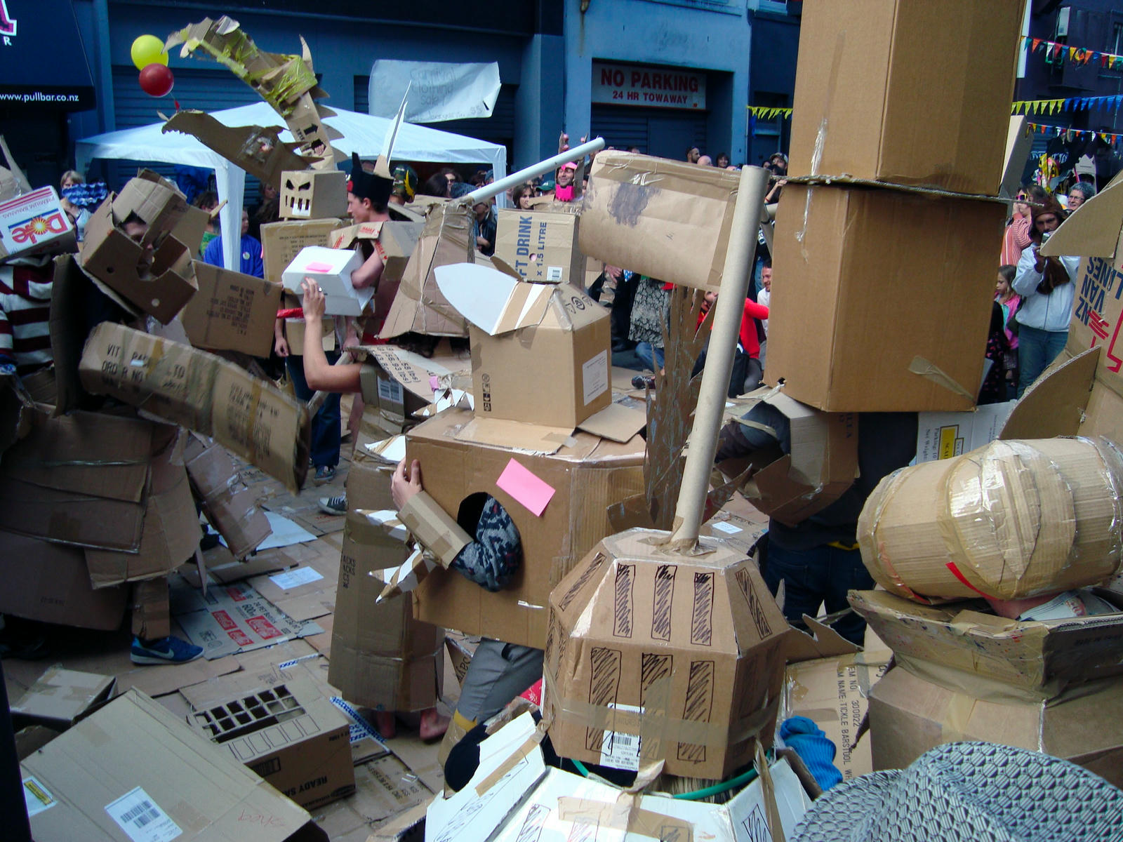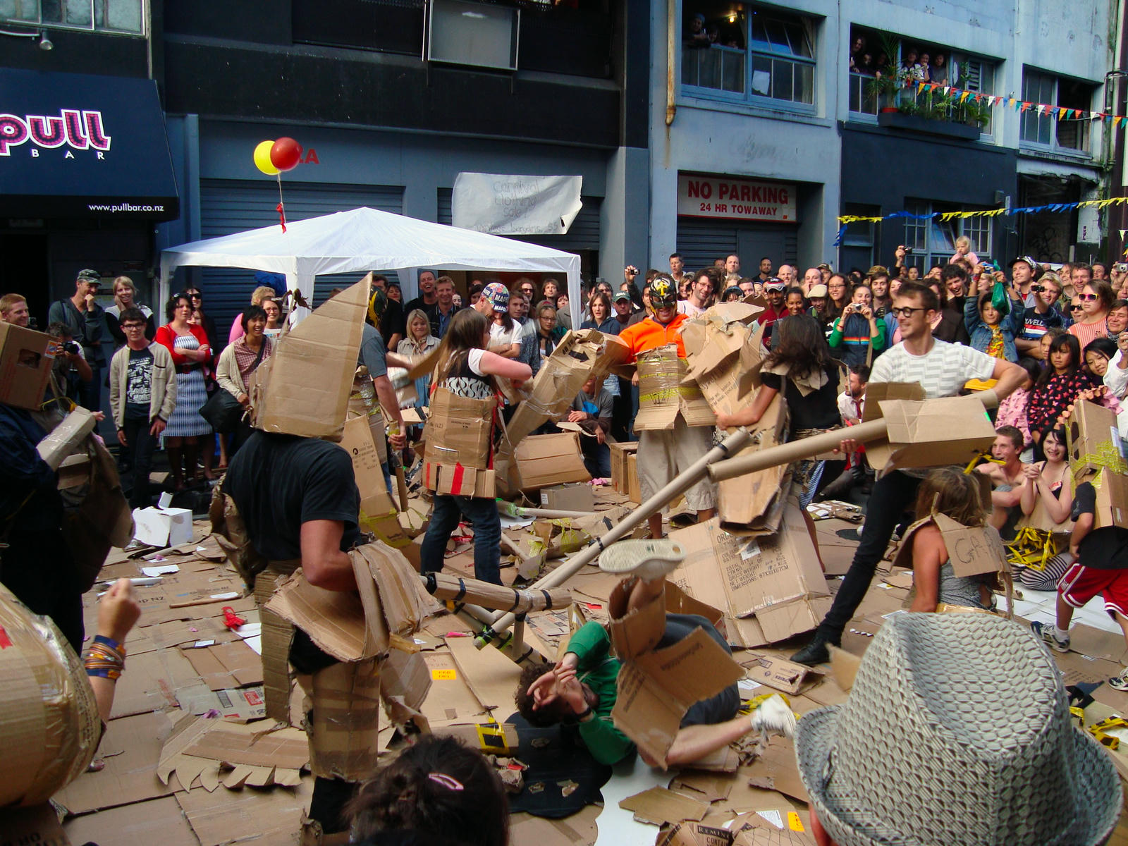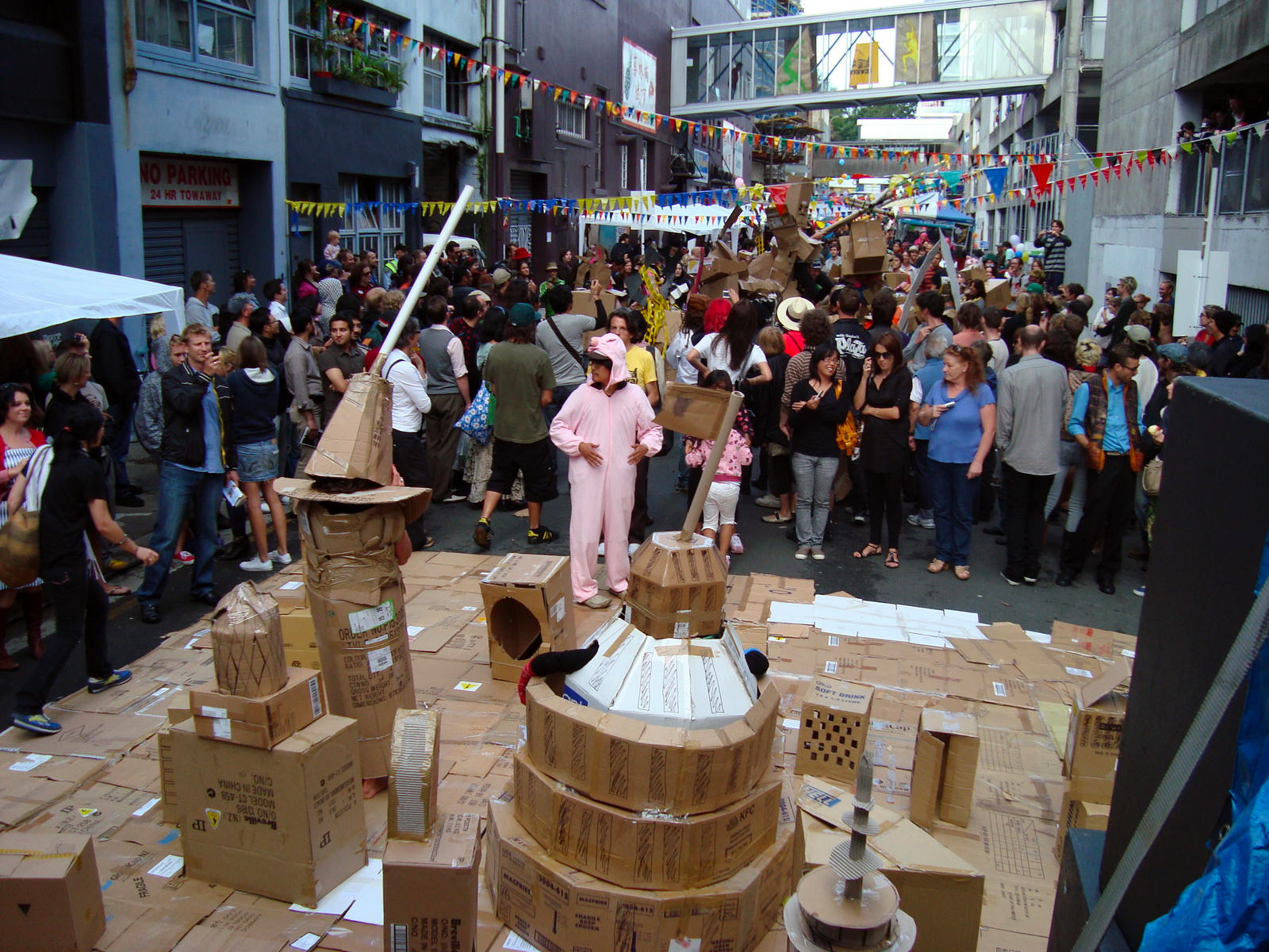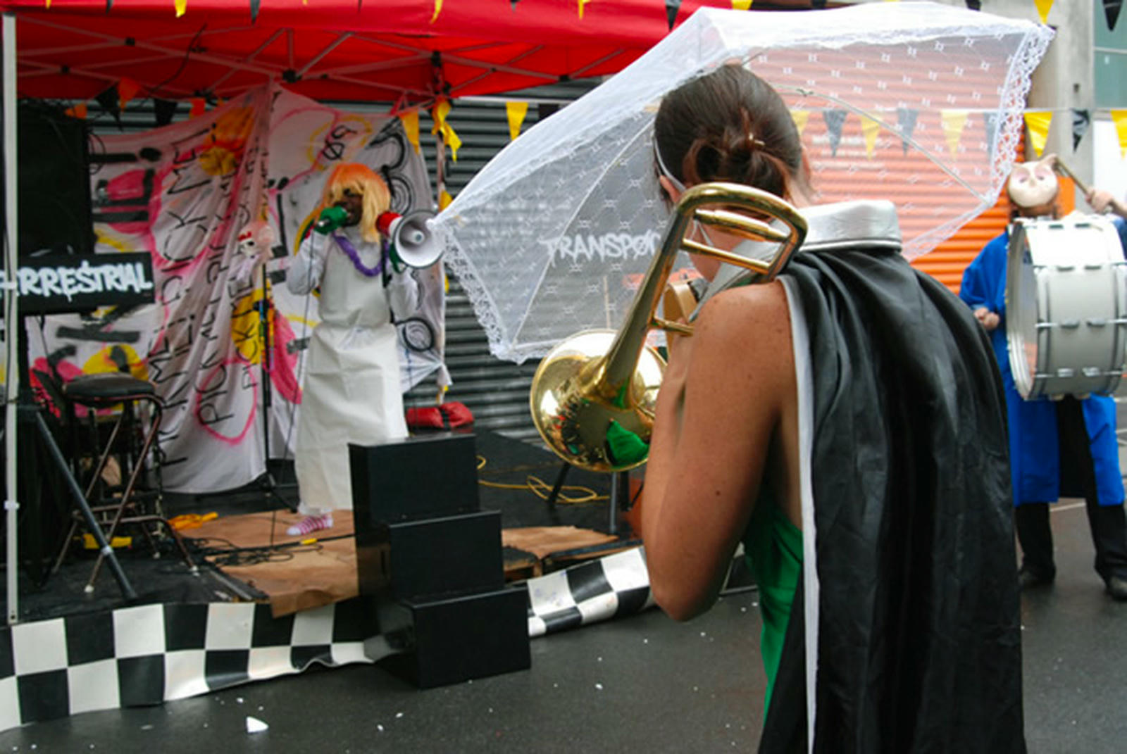 The performance programme included a short concert by the Auckland Mandolin Orchestra; roaming entertainment from jugglers, drag queens and the mysterious musical cult Fertility Festival; and Joie de Musee, Musee de Vivre, a collaborative street piece by Michelle Osborne and photographer Jennifer French. A dedicated activities stage also hosted an expanded Boxwars competition, which featured a choreographed performance titled Cardboard City vs Cardboard Monsters.